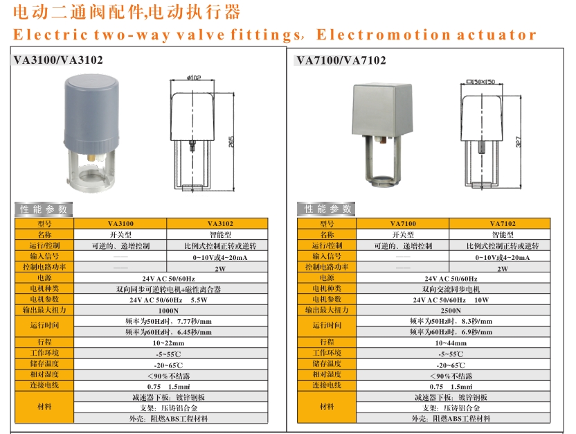 注:VA3100和VA7100为可逆转电机运作,提供递增式控制,开关型执行器配合传感器、变压器、比例积分电子温控器(面板)和阀门使用,称5件套,独立控制。